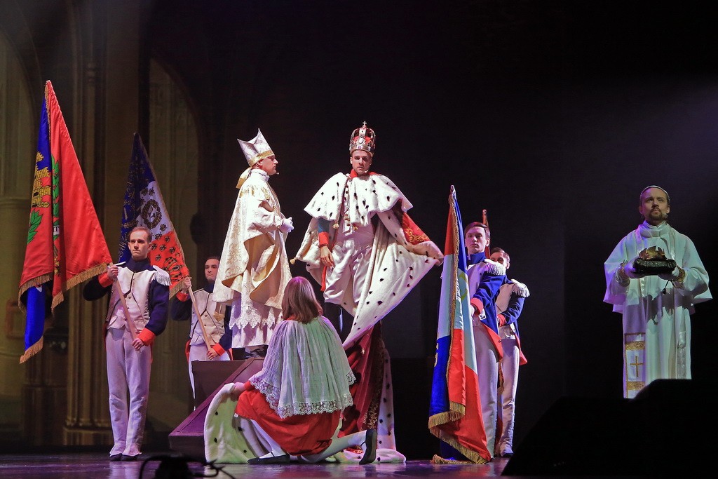 История его воинских походов, несчастной любви к Наташе, поисков себя и, наконец, мучительной смерти рассказана на фоне глобальных политических потрясений. Не зря в спектакле немалое место занимают фигуры Наполеона и Александра I, а в либретто, которое Рыбников написал сам, помимо романа, вплетены манифест российского императора, а также дневники Наполеона и его речь на коронации в соборе Парижской Богоматери.