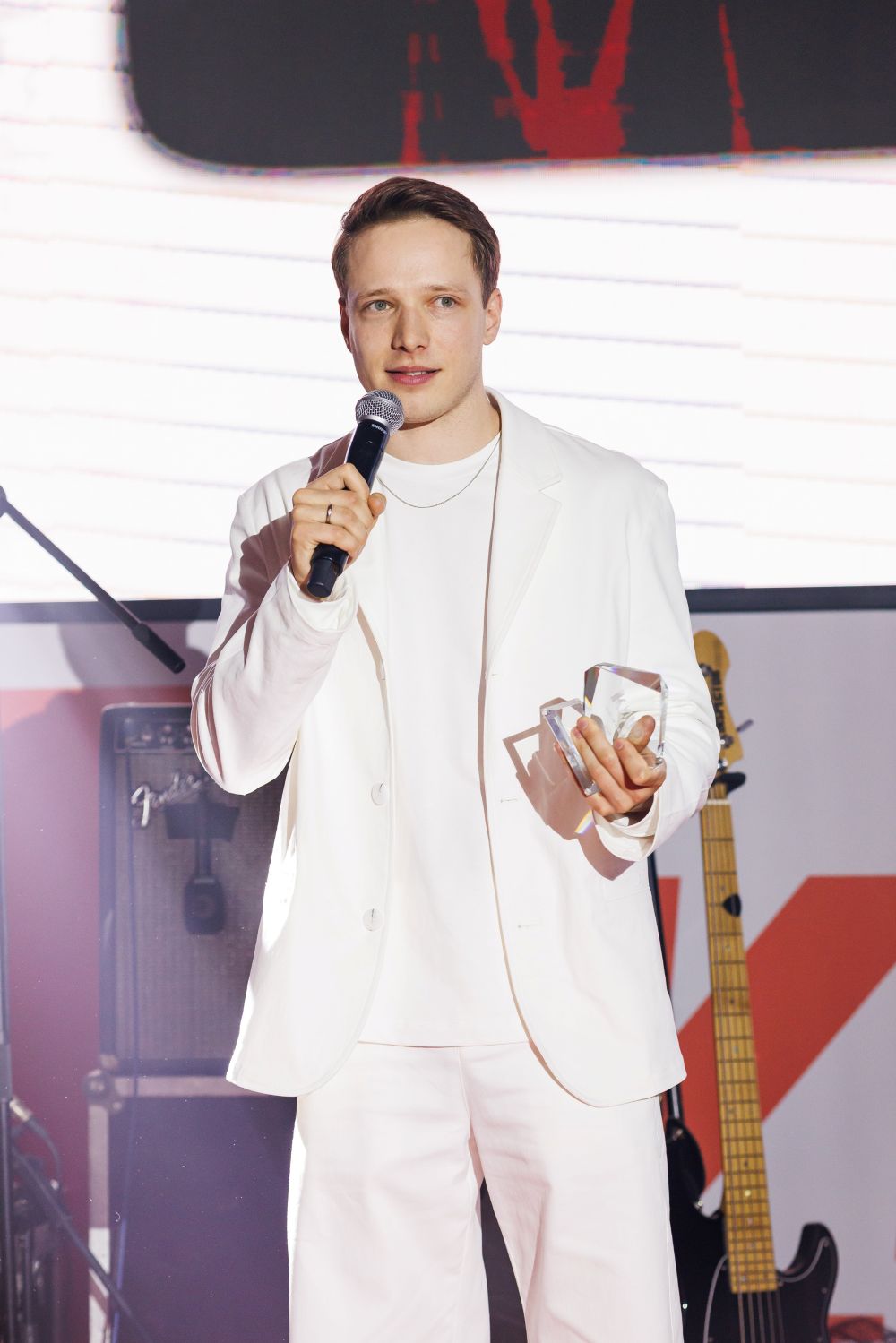 Алексей Онежен сделал ставку на закрытый плотный силуэт, разбавив строгость образа кроссовками в тон, небрежно повязанным галстуком и брошью-цветком. Классику – костюм с белой футболкой выбрали Сергей Городничий и Марк-Малик Мурашкин. А вот Даниэль Вегас решил обойтись без пиджака, зато украсил себя несколькими массивными кольцами. Олег Гаас, наоборот, отказался от рубашки в пользу почти классического пиджака, но с одним лацканом.