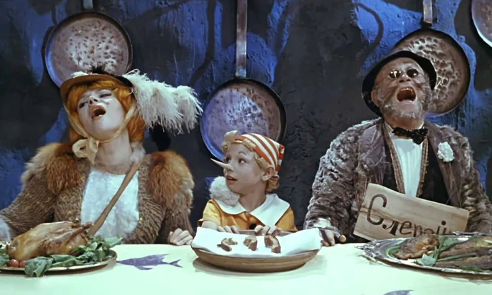 Задорный голосок околпаченному Буратино подарила Нина Гуляева, которая, к слову, чуть позже озвучила и другого культового персонажа итальянских сказок, что вышел из-под «лукового» пера Джанни Родари. А за Карло и его, простите, собутыльника Джузеппе, в чьи руки изначально и попало волшебное полено, заговорили харизматики Евгений Весник и Георгий Вицин. Стараниями умельцев из «Союзмультфильма» история заиграла всеми цветами радуги и, надо признать, убедительно разъяснила советским школьникам, что надобно остерегаться чернобородых верзил без семьи и совести. Ну и не слишком дружелюбных бульдогов, мошенников в мехах и прочую нечисть, призывающую сеять хаос.