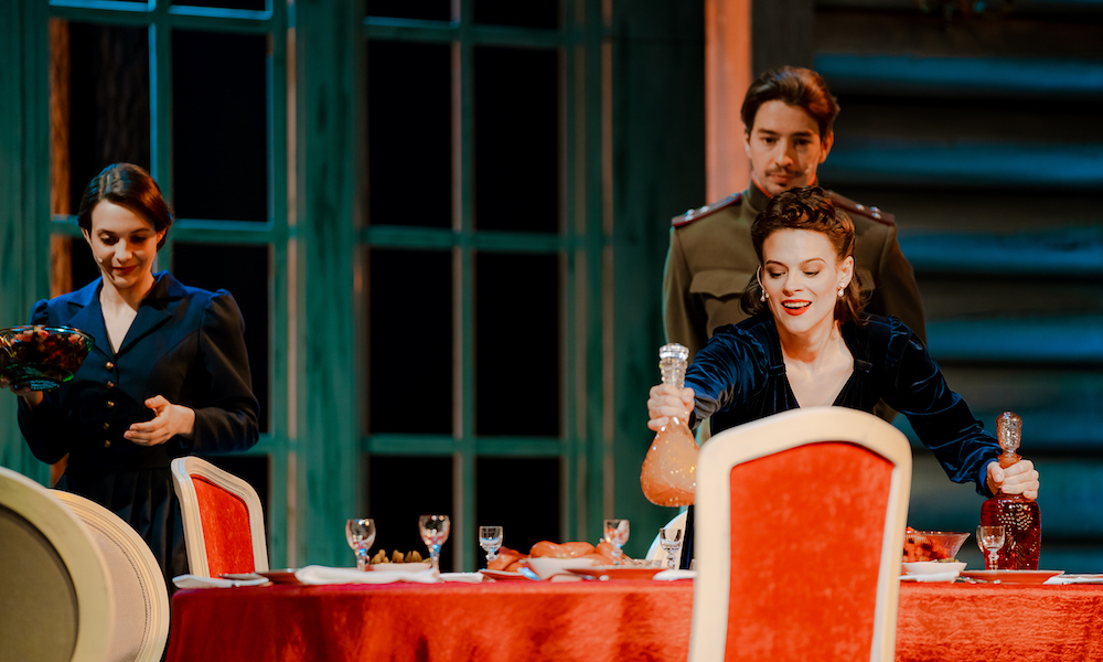 Действие этой авторской пьесы, тщательно пересобранной Богомоловым из отрывков классики, исторических фактов и аллюзий на современность, как и чеховского оригинала, начинается с именин Ирины (Светлана Божатова) – не сестры, но одной из дочерей Ольги. Вместо 5 мая 1895 года – 24 сентября 1944-го, и в авторском прочтении этот день совпадает не только с годовщиной смерти ее отца, но и входом в Эстонию русских солдат. Немцы отступили накануне, и вопрос о том, чего ждать от тревожного настоящего сменился другим: чего ждать от не менее неясного будущего? Особенно после долгих лет оккупации, которая для одних обернулась прискорбным, но вынужденным соседством, а для других – вполне последовательным коллаборационизмом.
