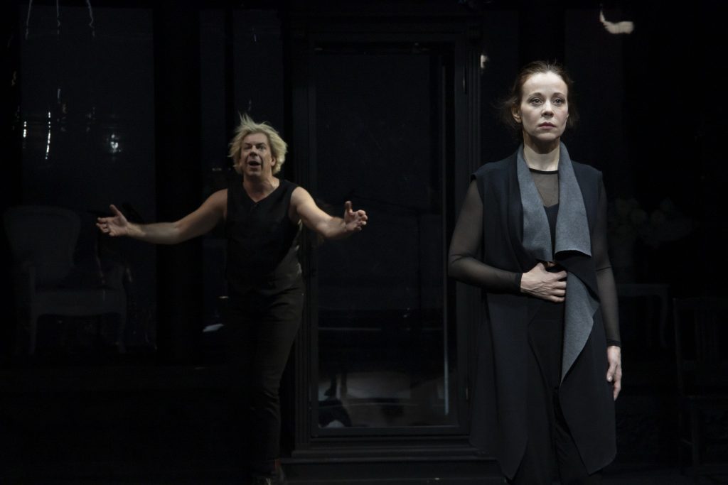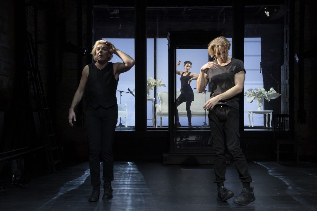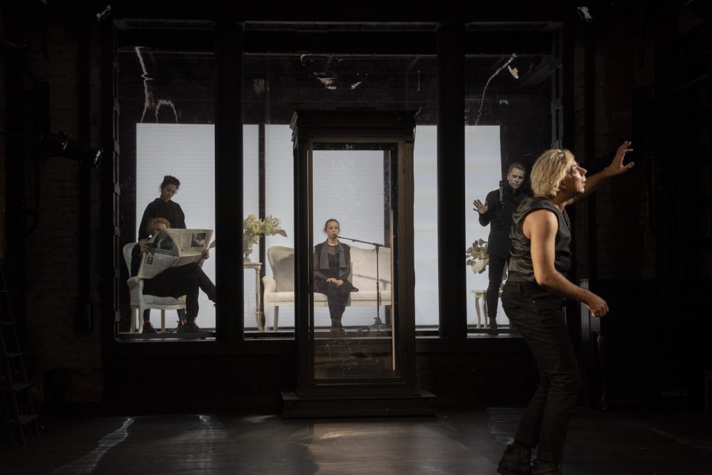 В роли коммивояжера Грегора Замзы выступил Владислав Демченко. Он появляется перед зрителями заключенным в прозрачное сооружение геометрической формы. Никакого грима. Никаких декораций. Атмосферу создает само пространство сцены и сдержанная сценография Максима Обрезкова. Да еще артисты. Помимо Демченко, на сцене их четверо. «Я для себя называю всех персонажей нашего спектакля «хор Грегора«, — так режиссер-постановщик объясняет свое решение. — Как в греческой трагедии, этот хор спрашивает, пытается отвечать, спорит, обвиняет, оправдывает». В этом, по его мнению, главный конфликт истории.