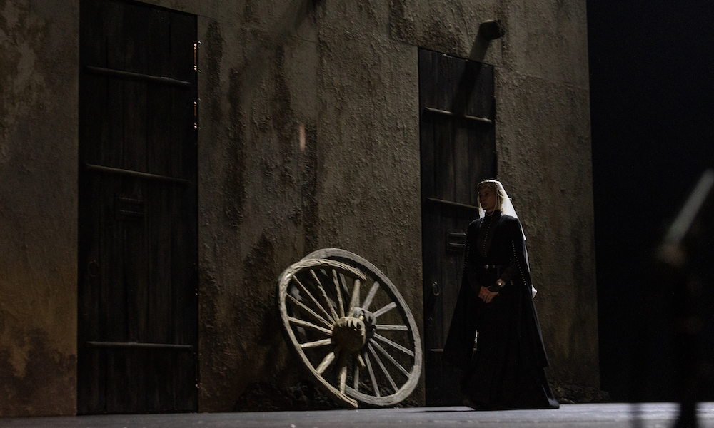 Серые, почти трупные стены, колесо (истории?), строй копий, превращающихся к финалу в Бирнамский лес, – все подчинено строгой архитектуре. Над сценой – конструкция, напоминающая острие кинжала или дамоклов меч, зависший над действием. За сценографию в спектакле тоже ответствен режиссер. Эта графитная аскеза напоминает по духу черно-белую «Трагедию Макбета» Джоэла Коэна: никакого историзма, только холодная геометрия власти. Шесть дверей в первой половине спектакля превращают его в «трагедию положений»: то и дело из дверей кто-то входит и выходит, их выбивают, захлопывают, их запирают, об них бьются. Чуть водевильно жизнь и смерть, как враждующие соседи, постоянно расходятся и сталкиваются в этих проемах.