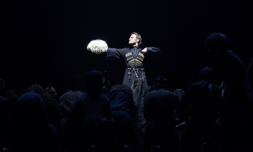 Живая музыка спрятана в ложе. Ансамбль здесь то вспыхивает лезгинкой, то отзывается мелодией, в которой угадываются и «Сары Гялин», и шалахо, и знакомые кавказские мотивы, становящиеся пульсом пространства. Отдельная ставка – голос. На актерах нет привычных микрофонов у рта: микрофоны установлены на авансцене и сверху, что создает риск частичной потери текста и одновременно возвращает театру физическое усилие речи. Сценический бой и сценическая речь – два экзамена, которые здесь сданы на отлично. Шекспировская (пастернаковская) мелодика сквозь лязг стали слышна отчетливо. Сначала артисты играют с кавказским акцентом, растягивают слова, подражая привычным интонациям, словно проверяя, сколько этнографии выдержит трагедия. Потом акцент почти исчезает: от кавказского скетча спектакль двигается к предельной универсальности.