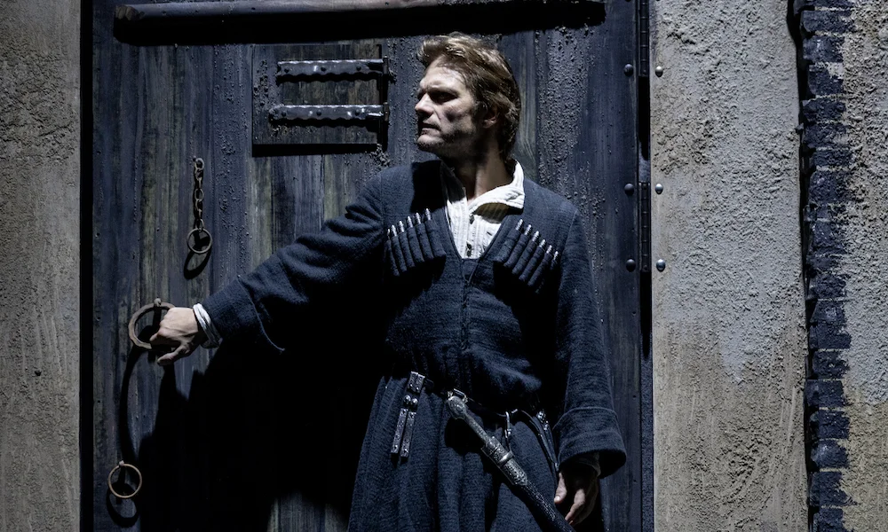 Живая музыка спрятана в ложе. Ансамбль здесь то вспыхивает лезгинкой, то отзывается мелодией, в которой угадываются и «Сары Гялин», и шалахо, и знакомые кавказские мотивы, становящиеся пульсом пространства. Отдельная ставка – голос. На актерах нет привычных микрофонов у рта: микрофоны установлены на авансцене и сверху, что создает риск частичной потери текста и одновременно возвращает театру физическое усилие речи. Сценический бой и сценическая речь – два экзамена, которые здесь сданы на отлично. Шекспировская (пастернаковская) мелодика сквозь лязг стали слышна отчетливо. Сначала артисты играют с кавказским акцентом, растягивают слова, подражая привычным интонациям, словно проверяя, сколько этнографии выдержит трагедия. Потом акцент почти исчезает: от кавказского скетча спектакль двигается к предельной универсальности.