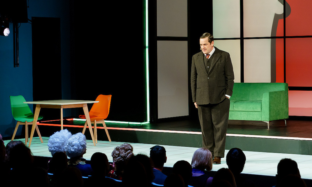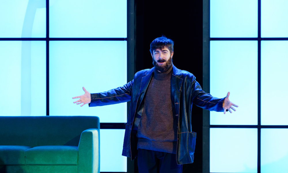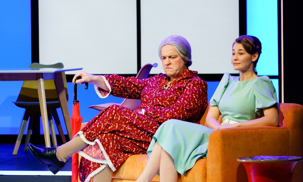 Константин Богомолов веселит зрителей всеми возможными способами. В первую очередь за комедию отвечает еще один персонаж – пожилая соседка в исполнении все того же Леры Горина. Он открывает спектакль, проходя через зал и вступая в импровизированные разговоры со зрителями. Позже бабка не раз выскакивает как чертик из табакерки из правого бенуара то с криком: «Десятая квартира, дайте поспать!», то со смешными комментариями.