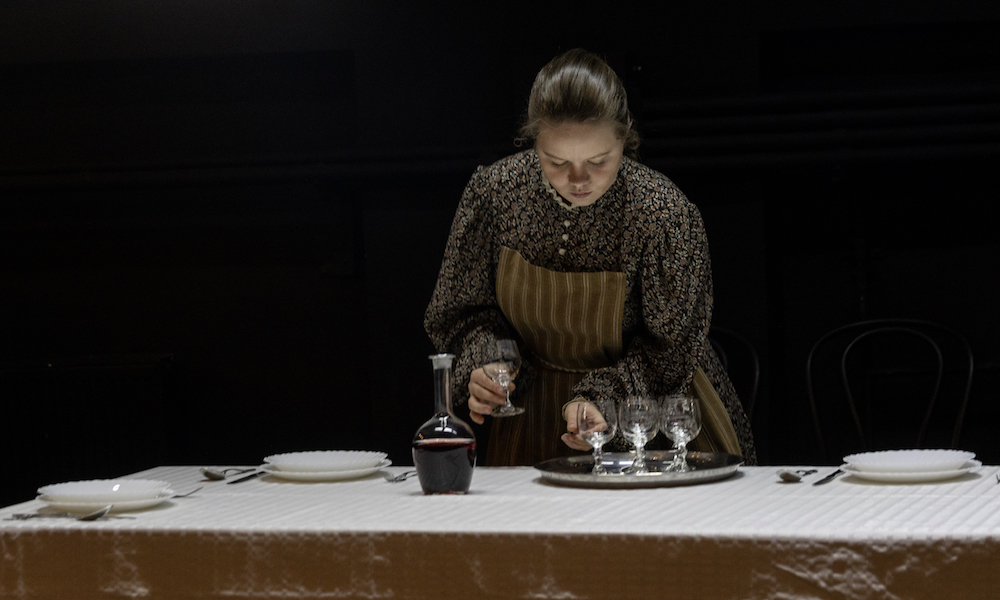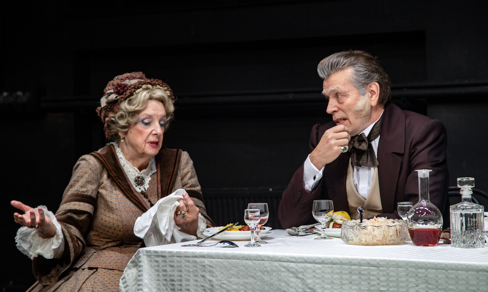 На длинном столе сервирован знакомый «национальный натюрморт» из вареной картошки, квашеной капусты, селедки с луком и того, что ко всему этому обыкновенно прилагается в хрустальных графинах. Если что и коробит публику, так это то, как скучающая на сцене горничная Грунька (Евгения Лях) шумно (заглушая, порой, реплики) сбрасывает все эти яства в металлическое ведро.
