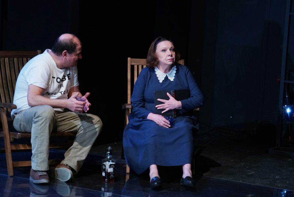 Перед зрителями на сцене мир обычной семьи, без указания конкретного места обитания. Традиционные пляжные атрибуты своего рода символы, поскольку действие происходит в основном в стенах одной квартиры, где кабинки для переодевания символизируют отдаленность, даже изолированность каждого из героев как друг от друга, так и от самих себя. В общем, еще одно погружение в мир несчастливой семьи. Как мы помним, «все счастливые семьи похожи друг на друга», что о них говорить… Семья из четырех человек: муж и отец по имени Георгий (Олег Тополянский). В этой же роли будет выходить на сцену и Игорь Золотовицкий. Лия, жена и мать (актриса Дарья Юрская); их сын-подросток Ваня (студент школы –студии МХАТ Павел Филиппов); появляющаяся время от времени сестра Лии, Лера (Наталья Рогожкина). И, наконец, представитель старшего поколения, главная героиня по имени Гера, пожилая женщина с явными признаками деменции, в прошлом, учитель литературы – в этой роли на сцене потрясающая Наталья Тенякова. Именно она, точнее, ее героиня задает тон всему повествованию. Представительница того поколения, когда все читали книги, поскольку айфонов и смартфонов еще не было, она полностью погрузилась в мир шекспировского «Гамлета», где в замке Эльсинор бушуют настоящие страсти. Порой, трудно понять, нарочито она перепутала эту жизнь в нашем времени с тем гамлетовским миром, или в этом бегстве от реальности смысл ее подходящей к финалу жизни?
