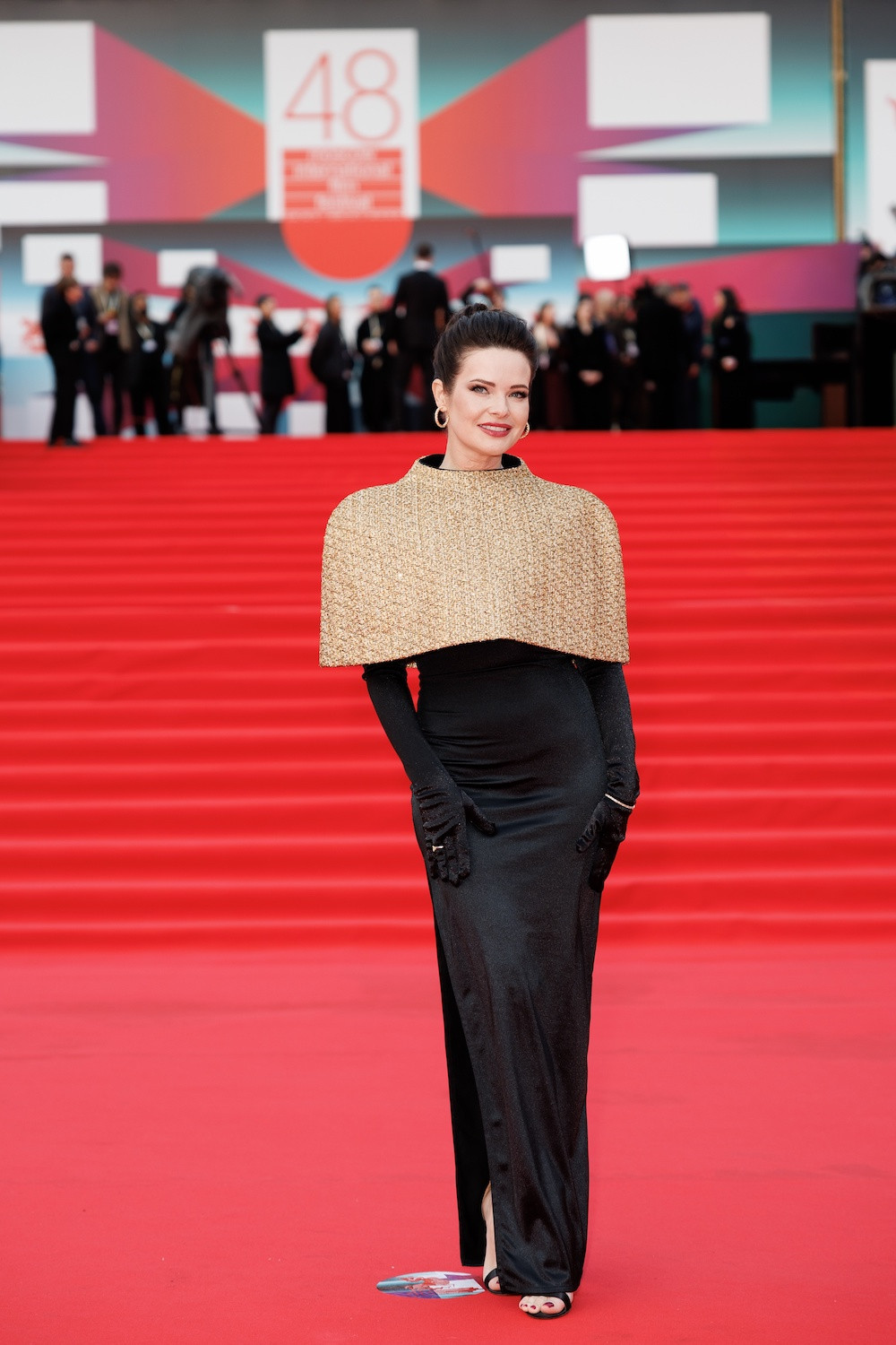 Поддержала золотистое настроение и Анна Пескова, чье черное платье макси выделялось из толпы благодаря блестящему кейпу с широкими плечами, который удачно гармонировал с серьгами актрисы. Экстравагантности образу добавили длинные перчатки в тон платья и строгий высокий пучок.