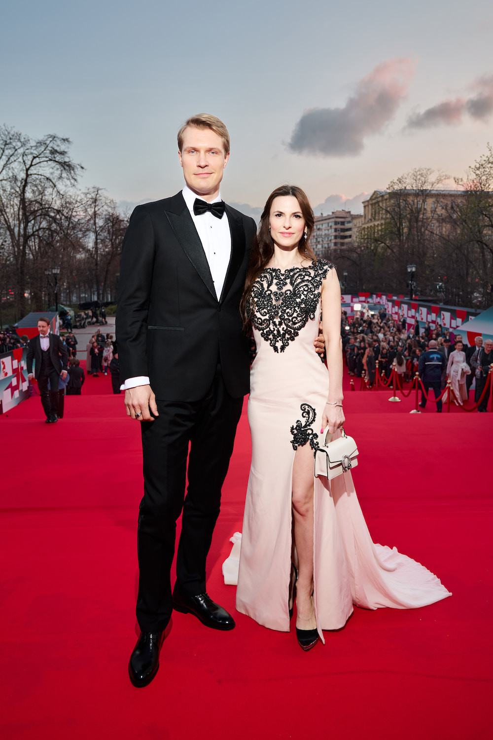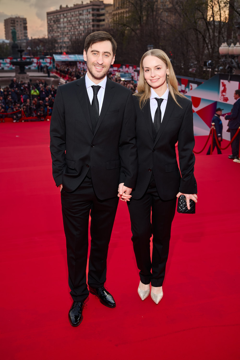 За любовное настроение на церемонии отвечали неизменно стильные звездные парочки. Актерский союз Дмитрия Чеботарева и Елизаветы Климовой удивил публику парными костюмными луками с галстуками. Разве что Дмитрий, в отличие от жены, не щеголял по дорожке в серебристых лодочках, а выбрал идеальные глянцевые туфли.