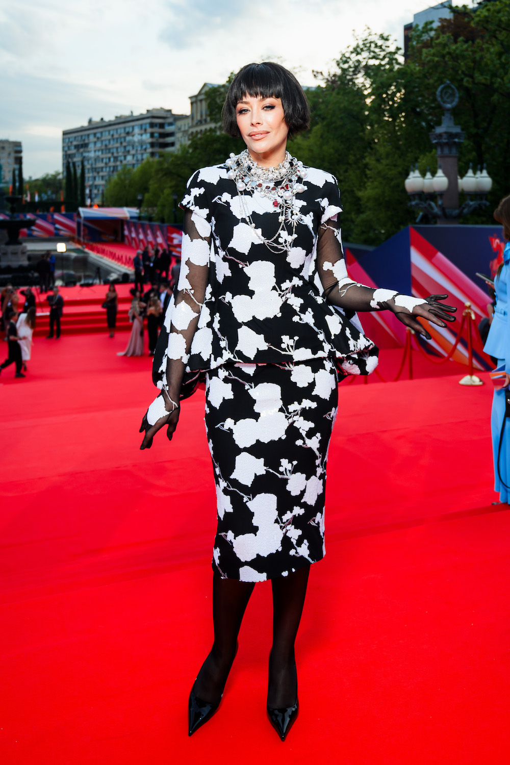 Белый растительный принт на черном фоне выбрала актриса и певица Екатерина Волкова. Наряд с объемной баской и тюлевыми рукавами, плавно переходящими в перчатки, она дополнила массивным шейным украшением, которое добавило фактурности. В свою очередь каре и остроносые туфли придали всему образу драматичности.