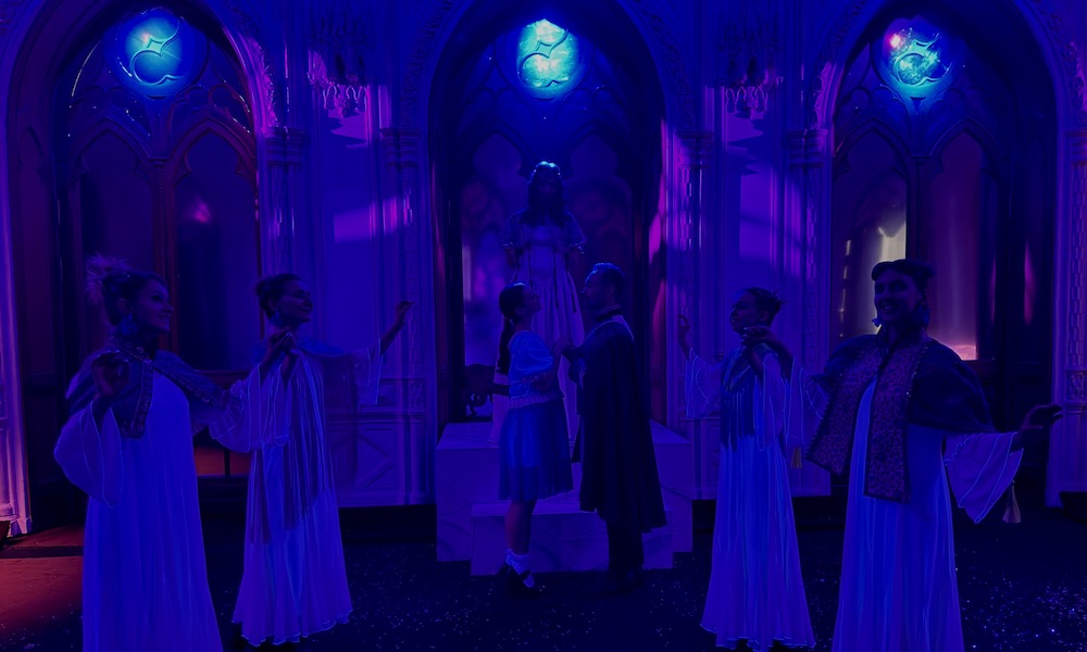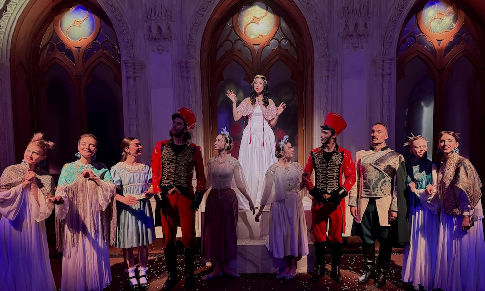 Призрачный свет – голубой, фиолетовый и розовый – создает атмосферу тайны, а артисты не выходят из образов даже в самых неожиданных ситуациях. Они иронично переглядываются, всегда готовые и выслушать гостей, и направить их, и даже позвать на самую настоящую сцену: когда в финальной части разыгрываются французские и немецкие романсы (классическая музыка дополнена стихами Виктора Лунина), иллюстрировать их вызываются юные добровольцы.