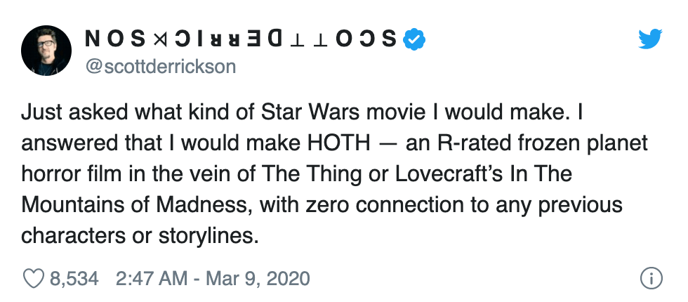 Скотт Дерриксон, режиссер «Доктора Стрэнджа», «Шести демонов Эмили Роуз» и «Синистера», обмолвился, что хотел бы снять фильм во вселенной «Звездных войн». В своем Twitter он рассказал, какой могла бы стать картина в его версии: