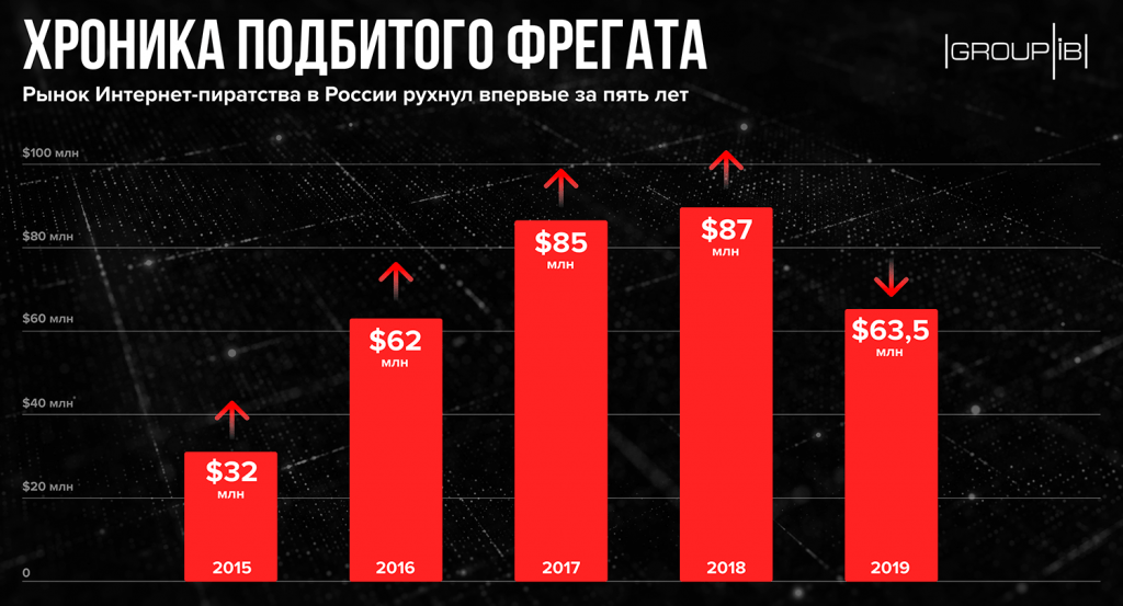 2019 год стал поворотным для интернет-пиратства: впервые за пять лет доходы нелегальных интернет-сервисов вместо роста показали падение. До этого наблюдался ежегодный рост, причем в 2016 году доходы увеличились почти в два раза. Сейчас же по прогнозам экспертов рынок пиратства снизится на 27% — с 87 миллионов долларов до 63,5 миллиона долларов.