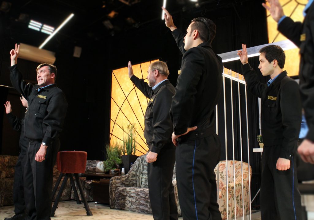 Действительно, злободневные темы поднимают в своем спектакле его создатели — драматург Саша Денисова, художник Нана Абдрашитова, композитор Владимир Горлинский. Почему выбрали охранников в качестве противопоставления героям историческим, понятно. Ведь охранники это по сути воины. Но эта участь для большинства — тяжкая повинность. Кто-то из них был рожден астрономом, кто-то геологом или географом, но нужда заставила работать охранником, поступившись своим предназначением. И кто в этом виноват? Время или они сами ? Большой вопрос. Ведь чем занято большинство рядовых мужчин сегодня на Руси? Они или торгуют, или охраняют. А если в душе мужчины есть тяга к героическому, где и как он может это реализовать? И вопрос — и большая проблема. Так что не нам судить — нужны ли они такие, «живущие в планктоновой зоне», нашему обществу. Они вынуждены жить по сложившимся правилам, у них зачастую просто нет выбора, но есть чувство ответственности за семью, за детей.