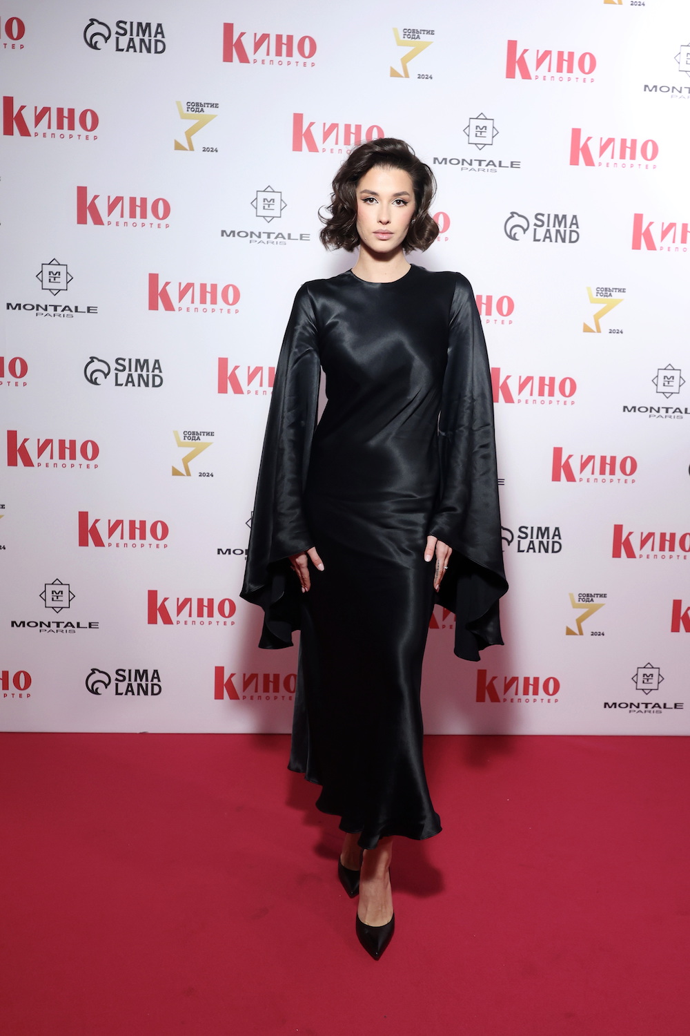 Актриса Мария Кончаловская также предстала в струящемся наряде. Строгость шелкового черного платья разбавила игривая укладка и броское колье.