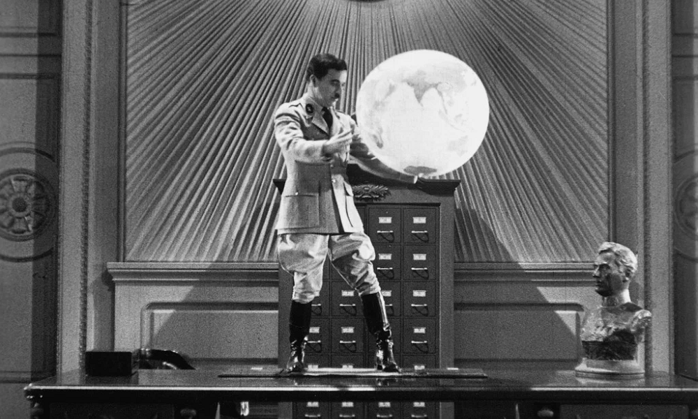 Вся чаплиновская суть заключалась в том, что Хинкель – не блестящий стратег и не могучий лидер. Он представляет собой всего лишь неуверенного в себе шута, который одержим собственным общественным имиджем, издевается над своими секретарями, наслаждается роскошью экстравагантных покоев и меняет политические решения, чтобы продлить себе пребывание у власти. А еще он общается на тарабарщине, питает слабость к излишней театральщине и производит невероятный отталкивающий эффект непомерным высокомерием.