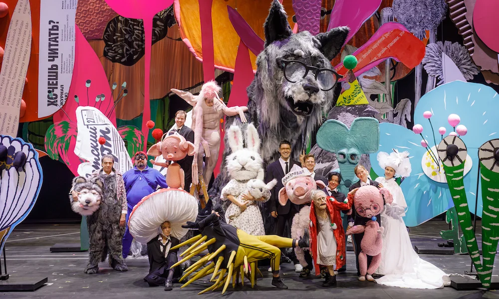 Вставки эти не только изящные, но и оправданные: огромный кукольный Волк, страдающий от расстройства пищевого поведения и не способный побороть собственный аппетит, случайно забредает на репетицию, где проглатывает всех актеров и реквизит.