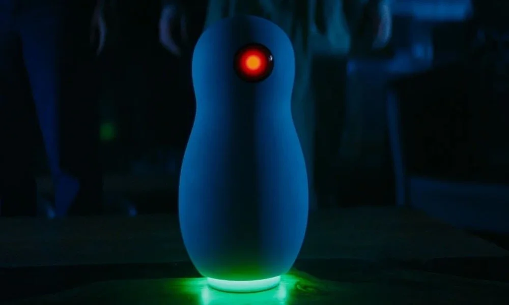 Незамыленность лиц артистов, бесспорно, фактурных и темпераментных, также играет в пользу картины. Частый комедийный игрок Дергачев и вовсе пускается во все тяжкие – только и следи за метаморфозами его простачка, покамест тон смышленого помощника достигает паранормально жуткой высоты. А пульсирующий алый глаз колонки, что, по всей видимости, приходится дальней родственницей кубриковскому HAL 9000, осматривает укромные уголки гнилого нутра принужденных к диалогу с ней пользователей. Которые, будто бы пророча свое заточение, с самого старта принимаются то ли истерично, то ли шутливо разглагольствовать о том, что ИИ всех непременно заменит и поместит в матрицу.