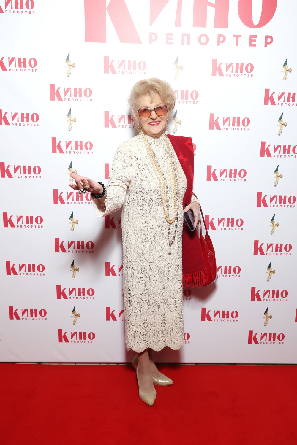 Народная артистка РФ Светлана Дружинина дает фору молодежи в свои 90 лет, щеголяя в изысканном вязаном под кружево платье, дополнив его фактурными ярко-красными акцентами – шарфом на одно плечо и сумочкой.