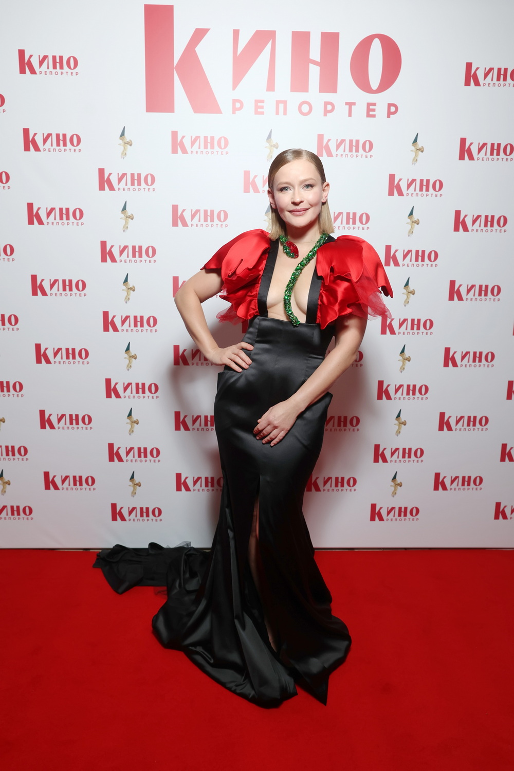 Запал на дерзкие цветовые акценты поддержала и ведущая церемонии Юлия Пересильд, чье уникальное платье, вероятно, запомнится гостям надолго. Глубокое квадратное декольте, которое обвивал «стебель с бутоном» из мерцающих стразов, вкупе с рукавами, напоминающими лепестки алых маков, буквально шло вразрез с черной, как ночь, струящейся юбкой со шлейфом. На лице – минимум косметики и игривая улыбка, сигнализирующая о том, что лук удался.
